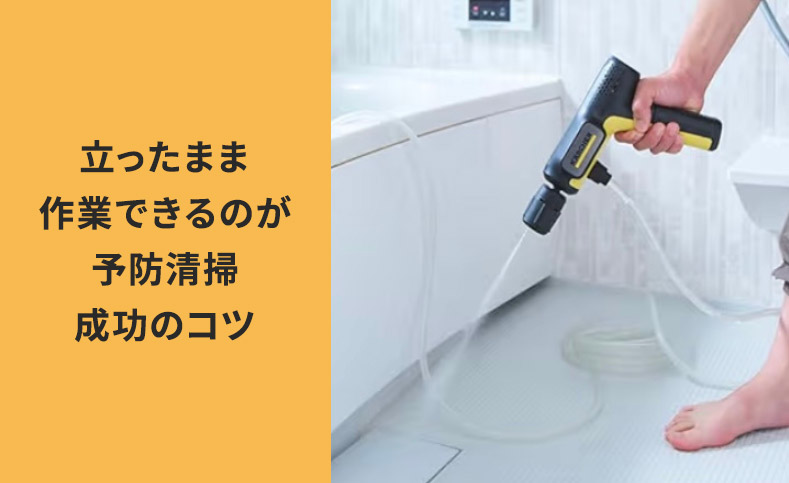 予防清掃を実施する際にとても重要になるポイントが『立ったままお掃除ができる』というところです。なぜお掃除を多くの方が大変だと感じるかと言えば、それは立ったりしゃがんだりする動作が繰り返されるから。とくにしゃがんだ姿勢で行うお風呂の床掃除などは、本当に骨が折れますよね。ところがこの充電式の高圧洗浄機があれば、立ったまま、お風呂の床はもちろん、壁も浴槽も排水口もすべてお掃除することができます。しかも洗剤を使わずに。ということは、お風呂上りにこの高圧洗浄機を取り出して、さっと洗浄するだけでお風呂はずっと綺麗なまま。高圧洗浄機、恐るべしです。